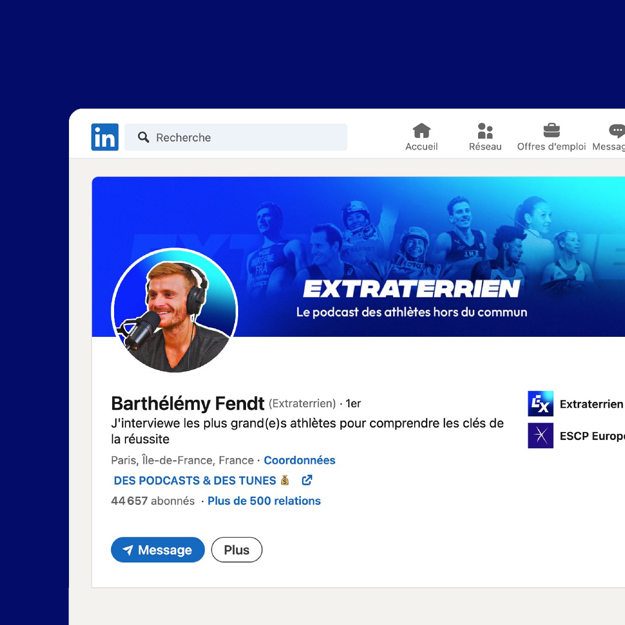 Création de la nouvelle identité du podcast EXTRATERRIEN, 1er podcast de sport en français. Ce podcast, tenu par Barthélémy Fendt, va à la rencontre de sportifs inspirants et hors du commun pour leur faire raconter leur histoire et avoir leur conseil.