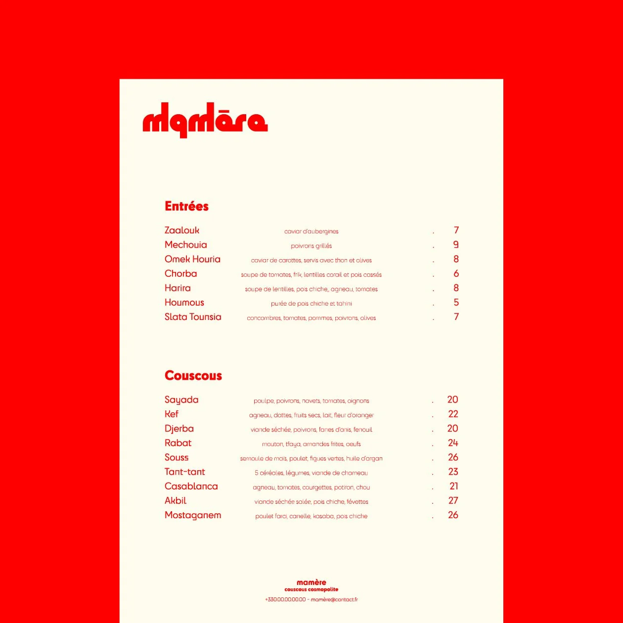 Mamère est un concept de restaurant de couscous. Basé sur un jeu de mot “mamère” facilement identifiable et un slogan qui l’est tout autant “pas de meilleur couscous que celui de mamère”. Mamère se veut être un restaurant cosmopolite en proposant des couscous de tout pays avec comme lien l’esprit de partage, et de chaleur qu’évoque si bien ce plat.